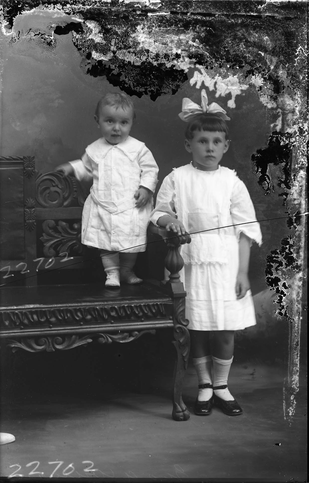 Two unidentified young children, a toddler and an older girl with a bow in her hair, are posed together with a bench.