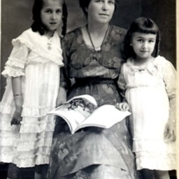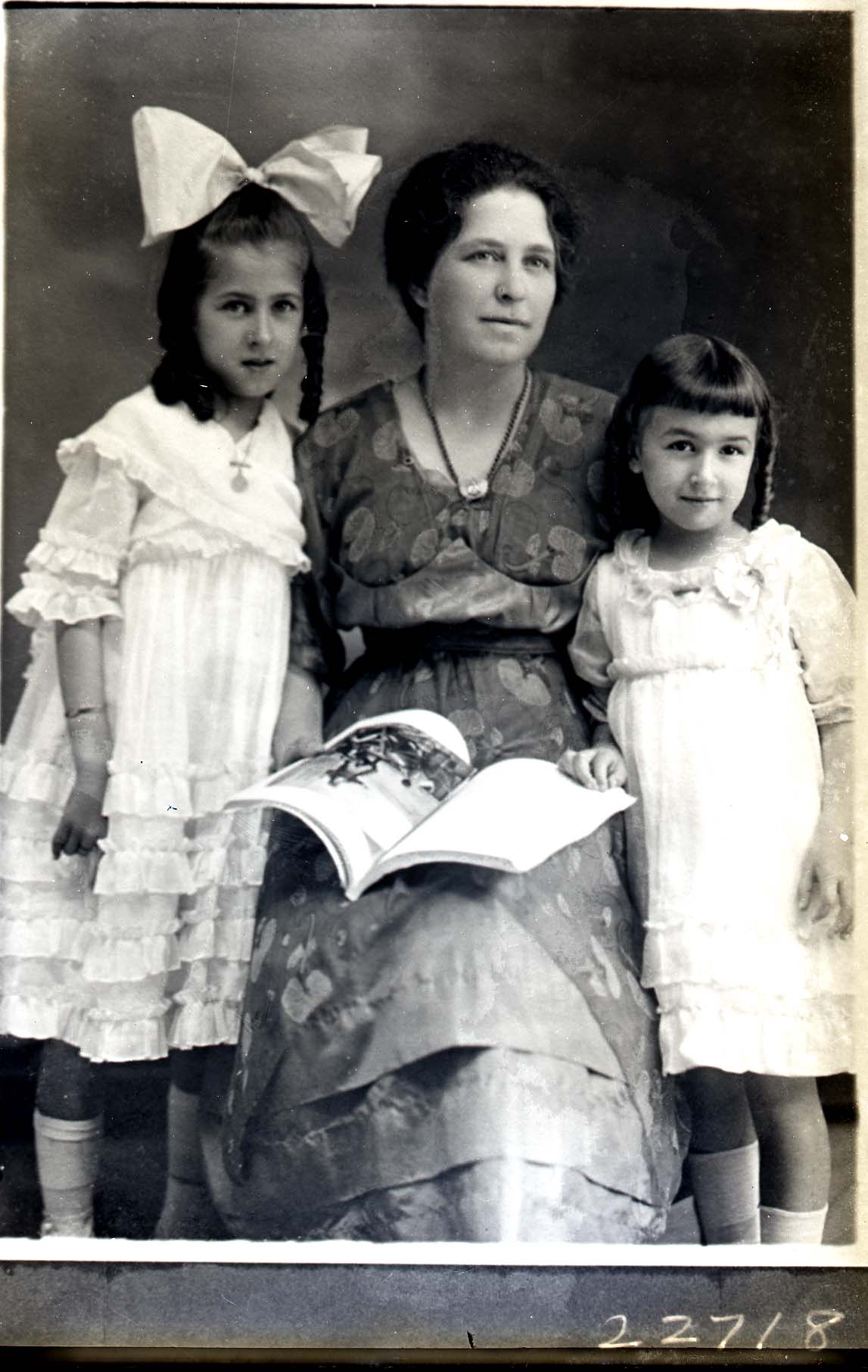 Photo of a photograph of an unidentified woman, seated with an open book on her lap, and flanked by two unidentified young girls.