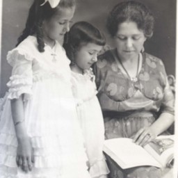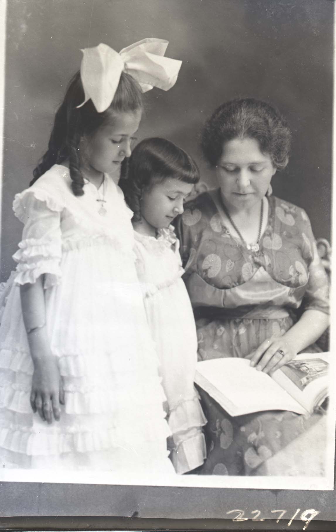 Two unidentified young girls, one with a large bow in her hair, are standing beside an unidentified woman who is seated with an open book on her lap. All three are looking down at the book.