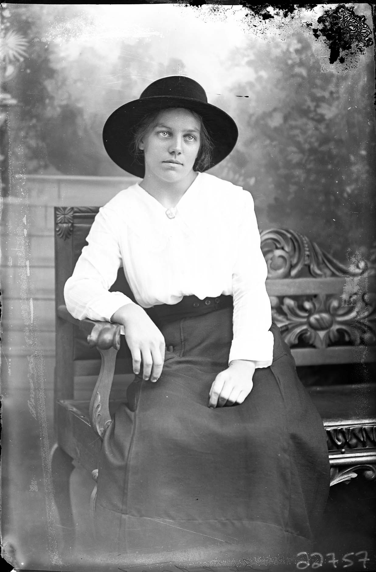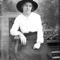 Unidentified woman in a wide-brimmed hat is seated on a bench.