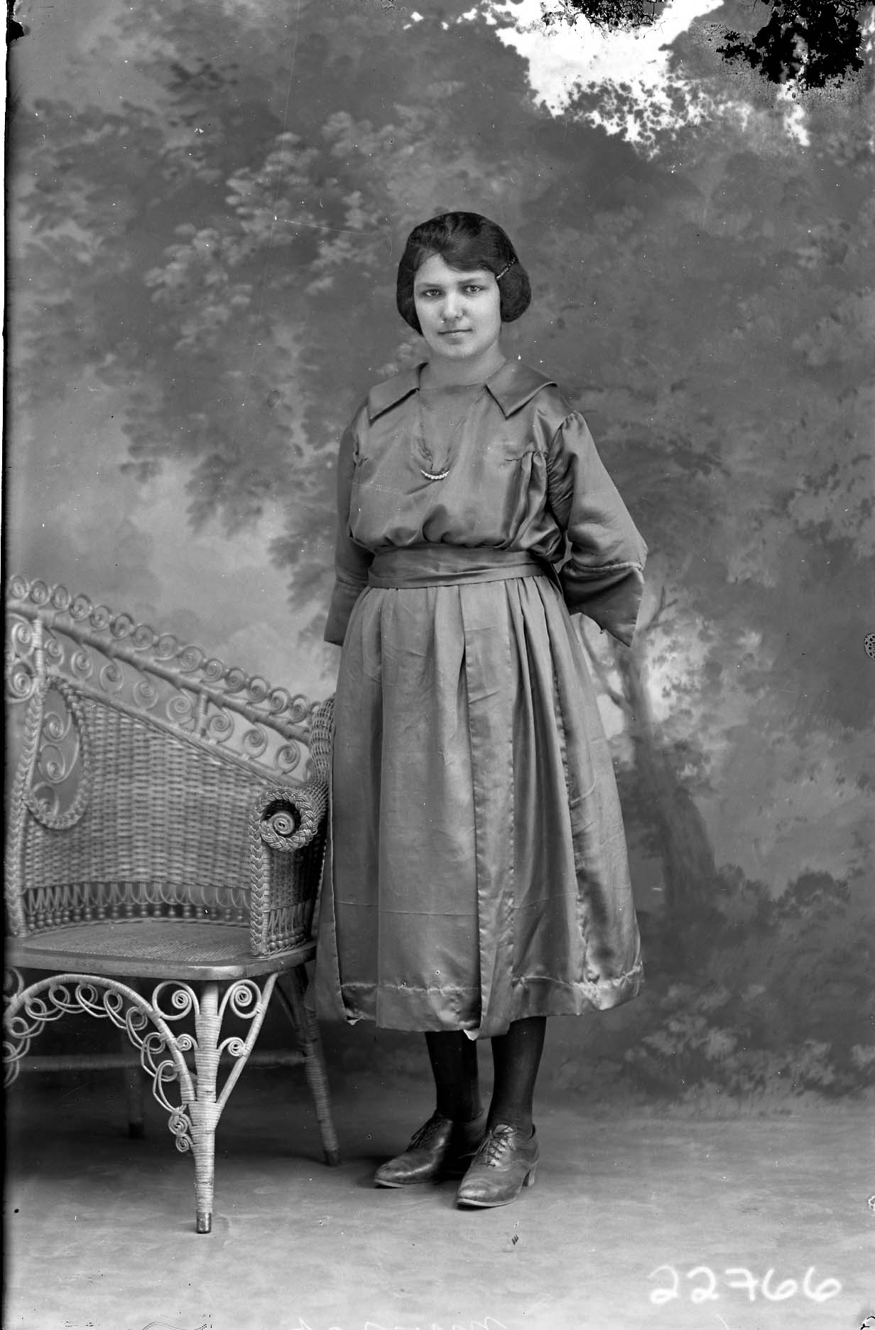 Unidentified young woman with short hair is standing by a wicker chair with her hands behind her back.