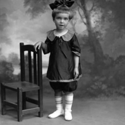 Unidentified young girl with a bow in her short hair is standing beside a child-sized chair.