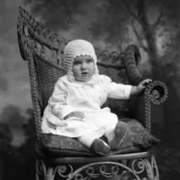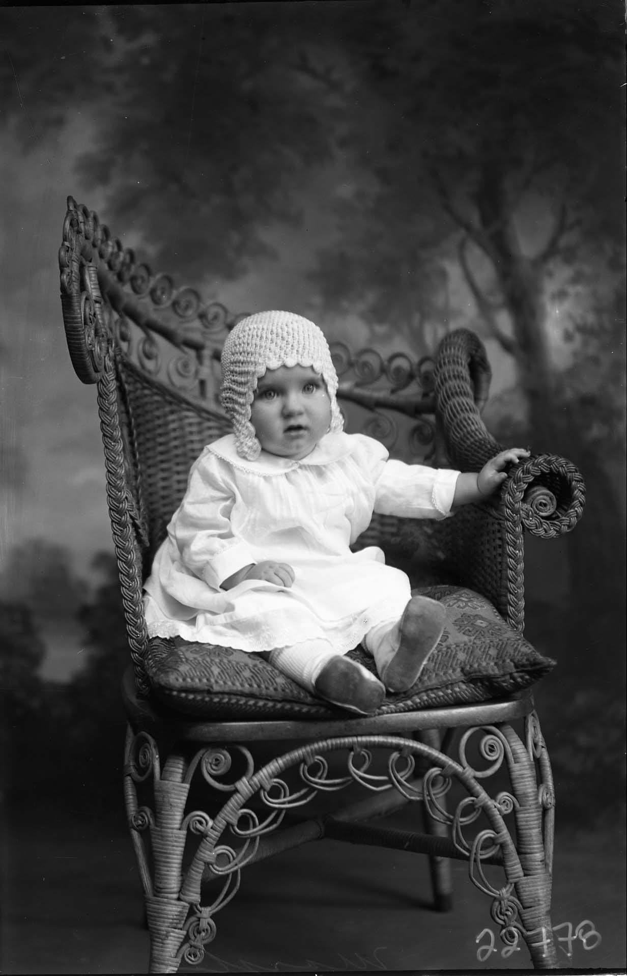 Unidentified toddler is wearing a knit cap and is seated on a pillow on a wicker chair.