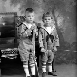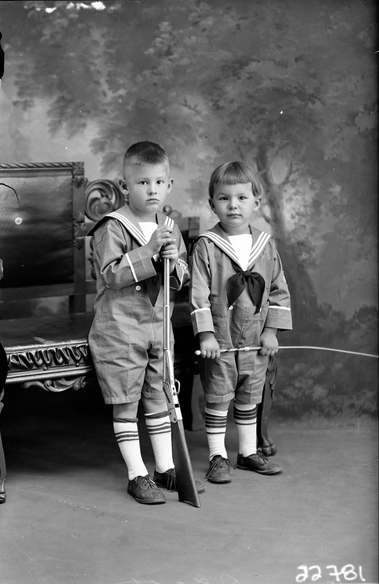 Two young unidentified boys are standing together by a bench. Both boys are wearing matching sailor-themed outfits. One boy is holding a rifle while the other is holding what appears to be a riding crop.