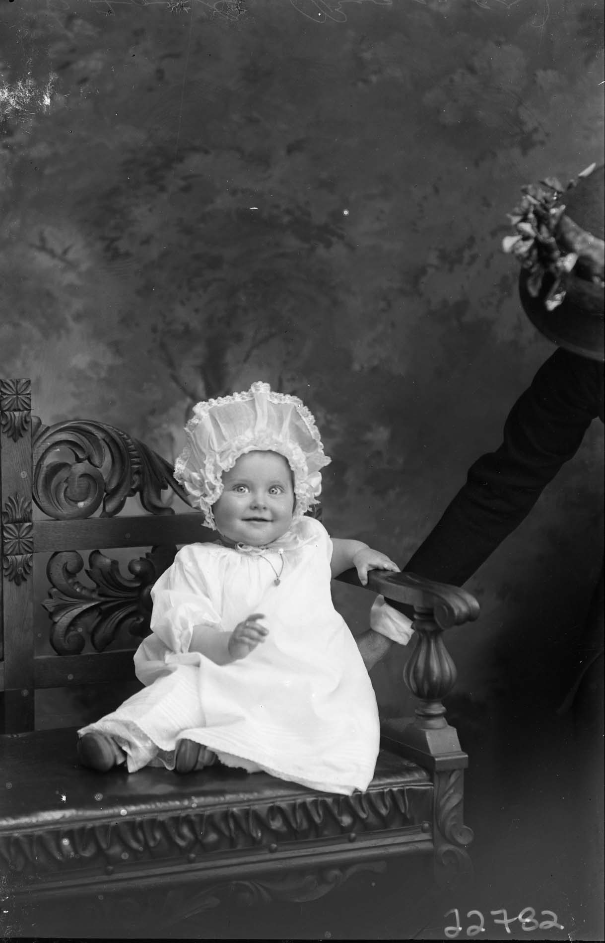 Unidentified smiling young child wearing a bonnet and a necklace is seated on a bench.