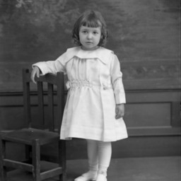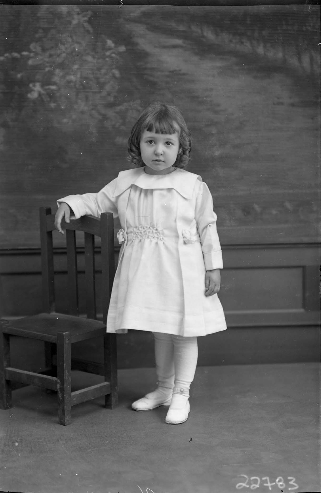 Unidentified young girl with short hair and bangs is standing beside a child-sized chair.