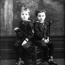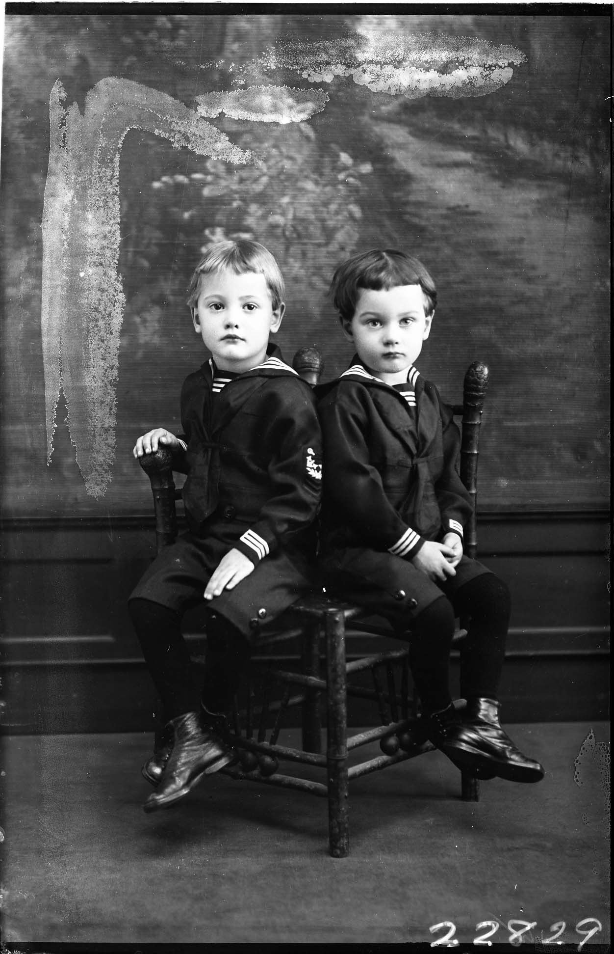 Two unidentified young boys are posed together on a chair. Both are wearing matching sailor-themed outfits.