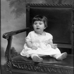 Unidentified young child with short hair and bangs is seated on a bench.