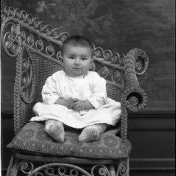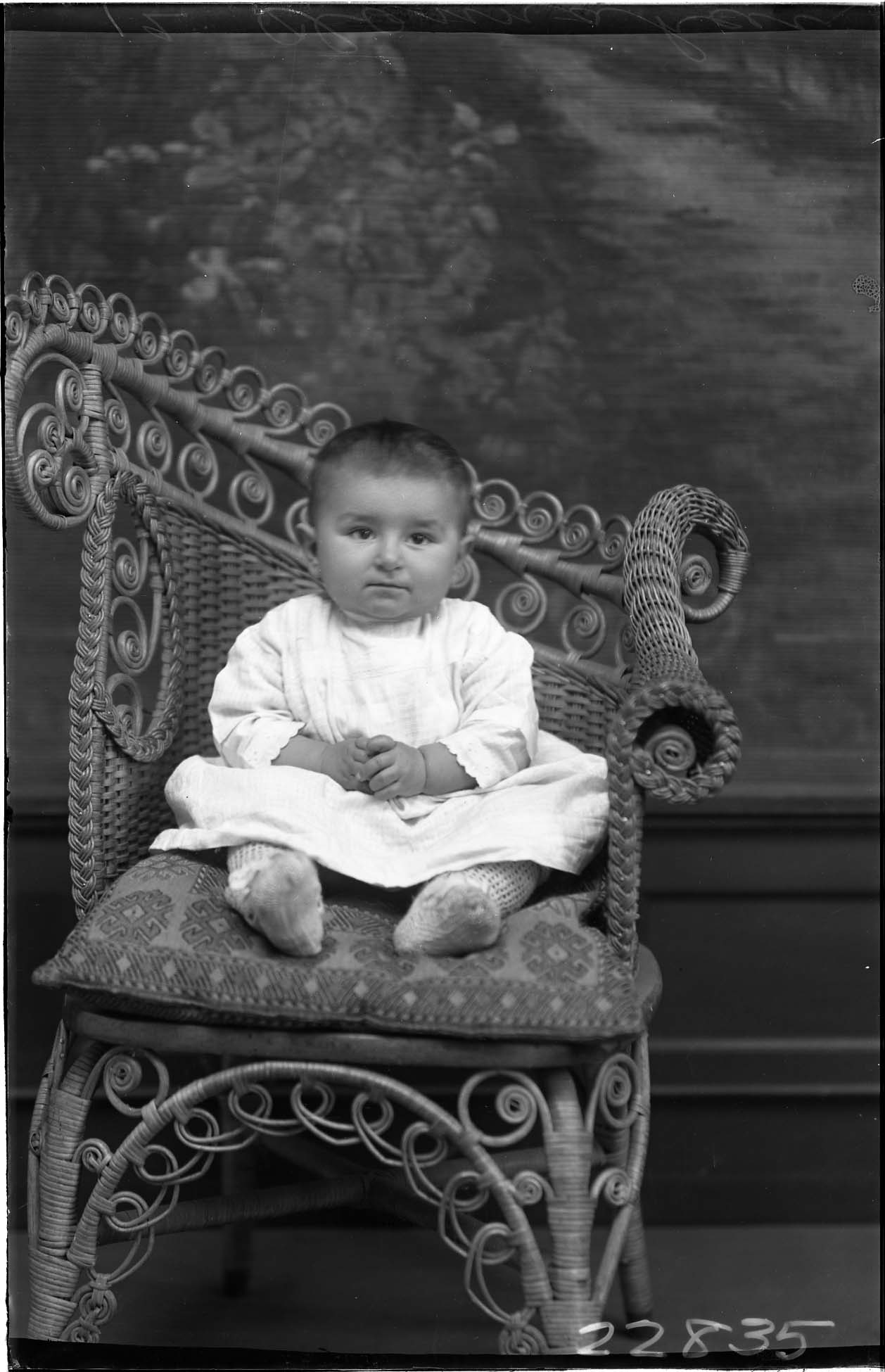Unidentified young child is seated on a pillow on a wicker chair.