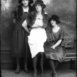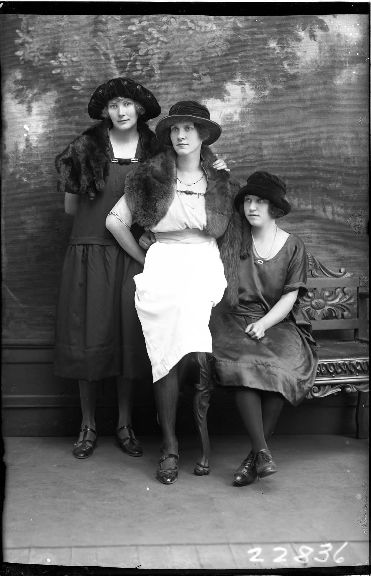 Three unidentified young women, all wearing hats, are posed together. The two women on the left are also wearing fur stoles.