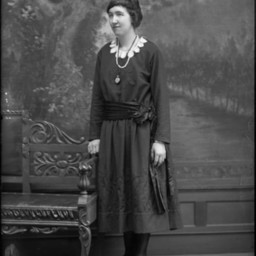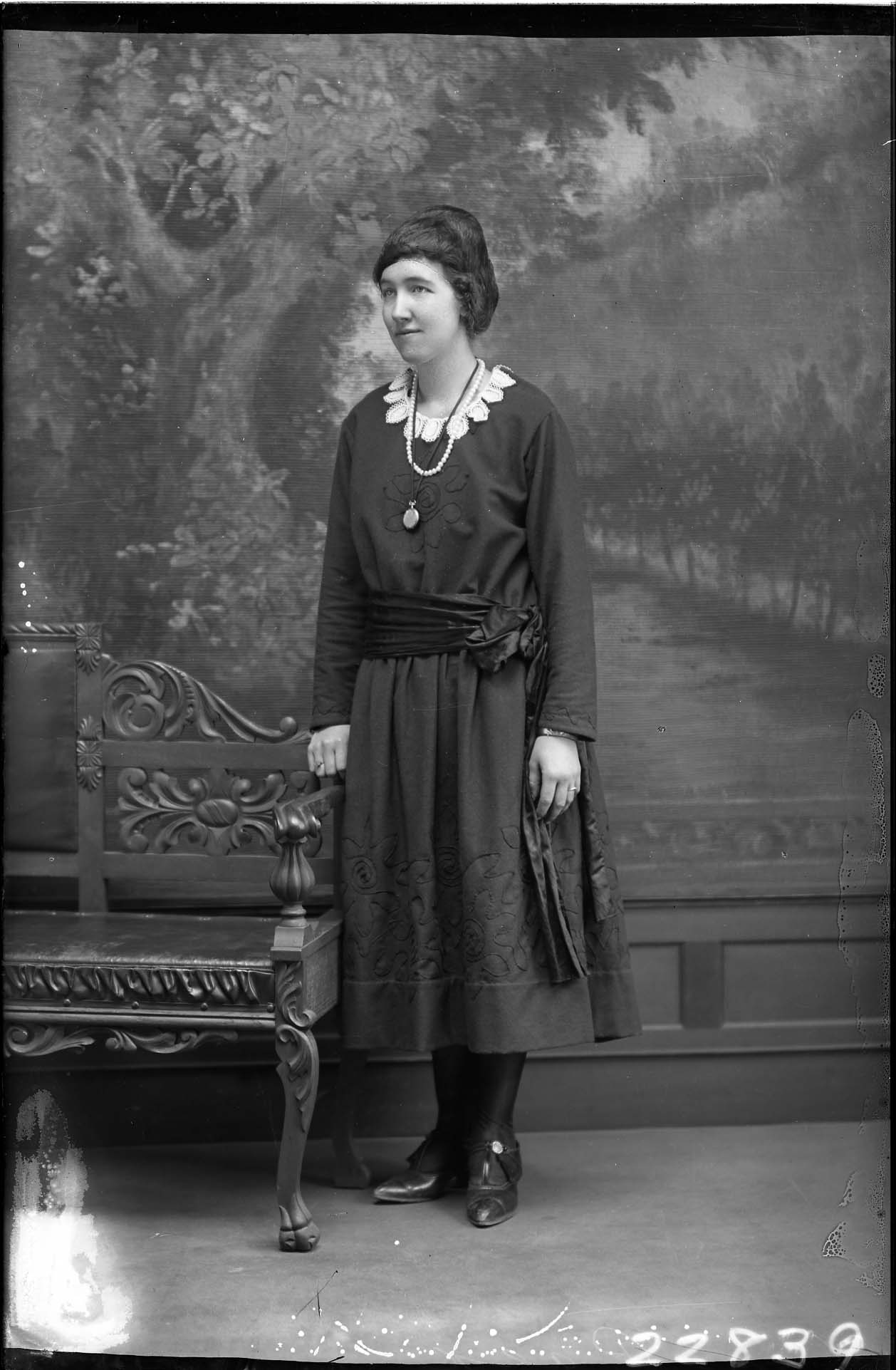 Unidentified woman wearing a faux pearl necklace and a long-sleeved dress is standing by a bench. She also has a locket or pocket watch around her neck.