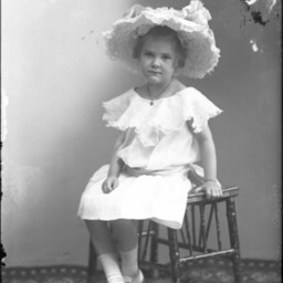 Unidentified girl is wearing a wide-brimmed hat and is seated on a stool.