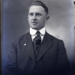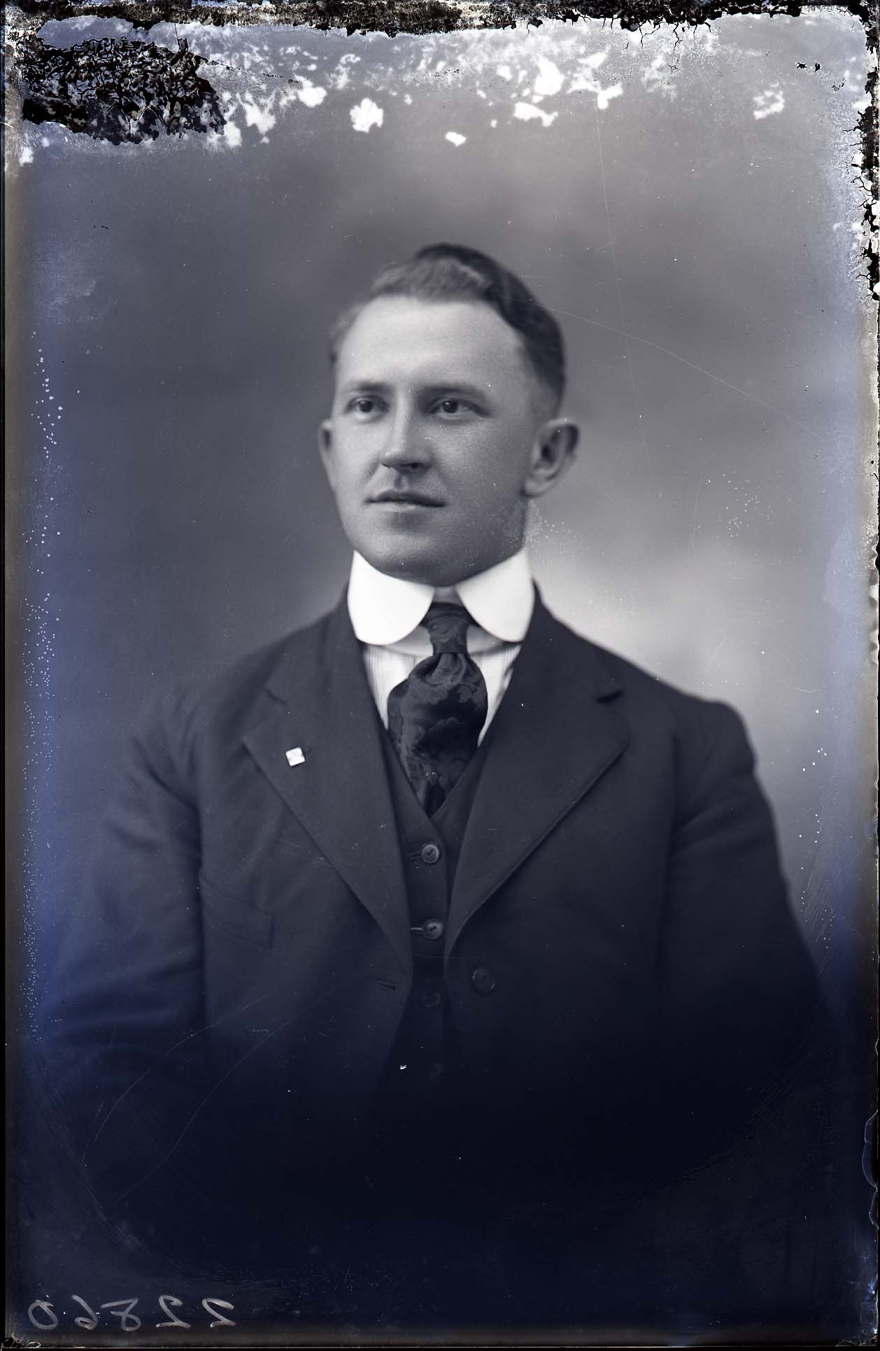 Portrait photograph of an unidentified young man wearing a suit and tie with a starched collar.