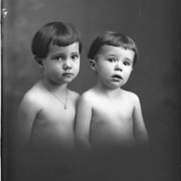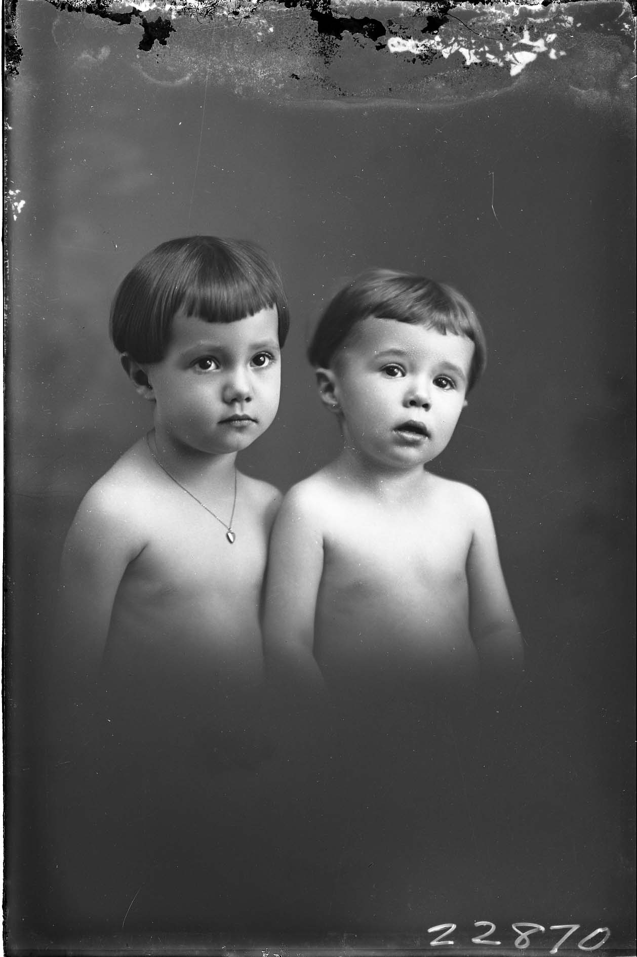 Two unidentified and shirtless children, both with bangs and one wearing a necklace, are posed together.