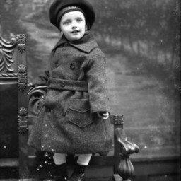 Unidentified young child in a winter coat and hat is standing on a bench.