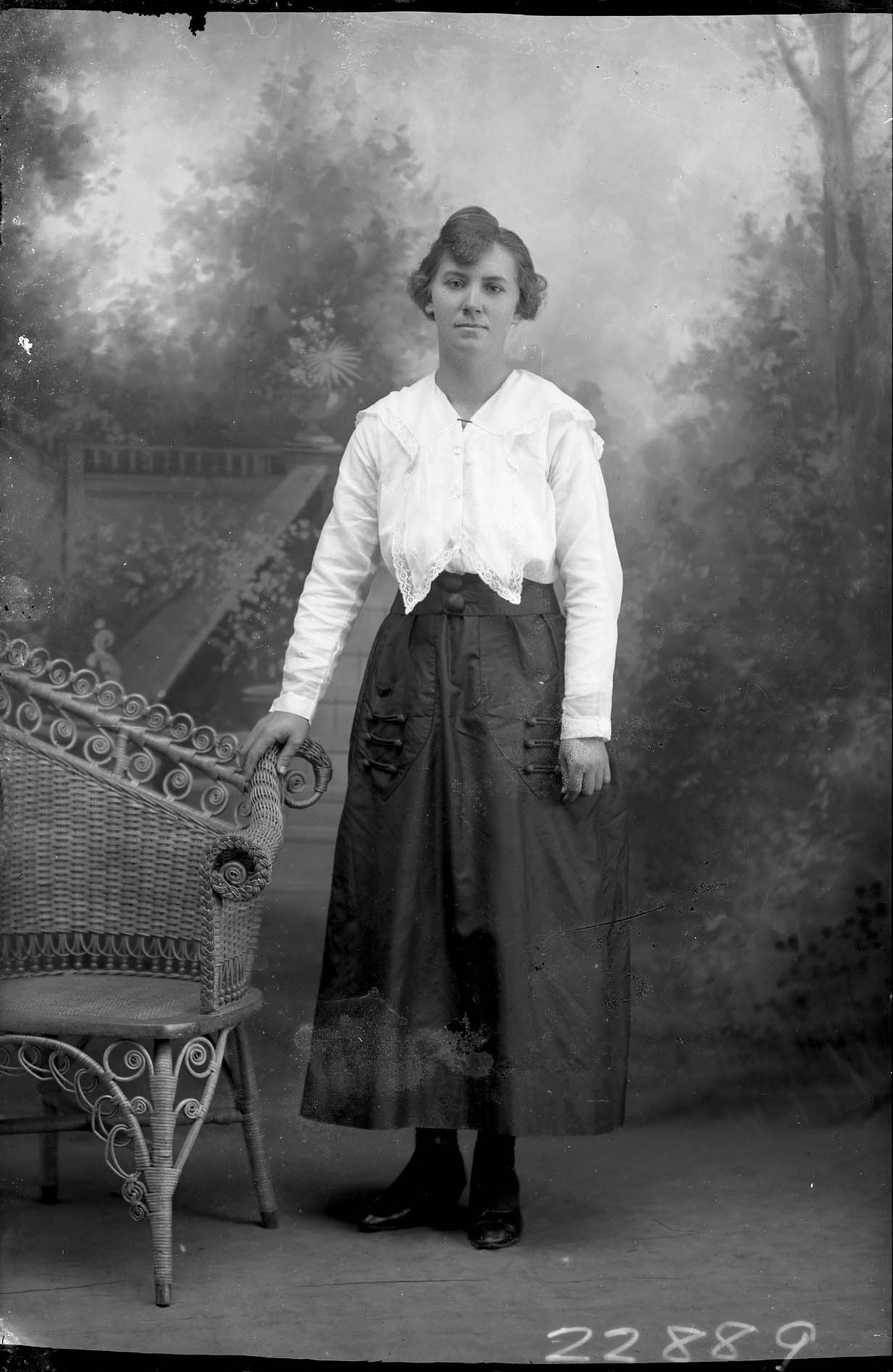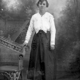 Unidentified woman with short hair is standing by a wicker chair and wearing a blouse and skirt.