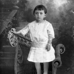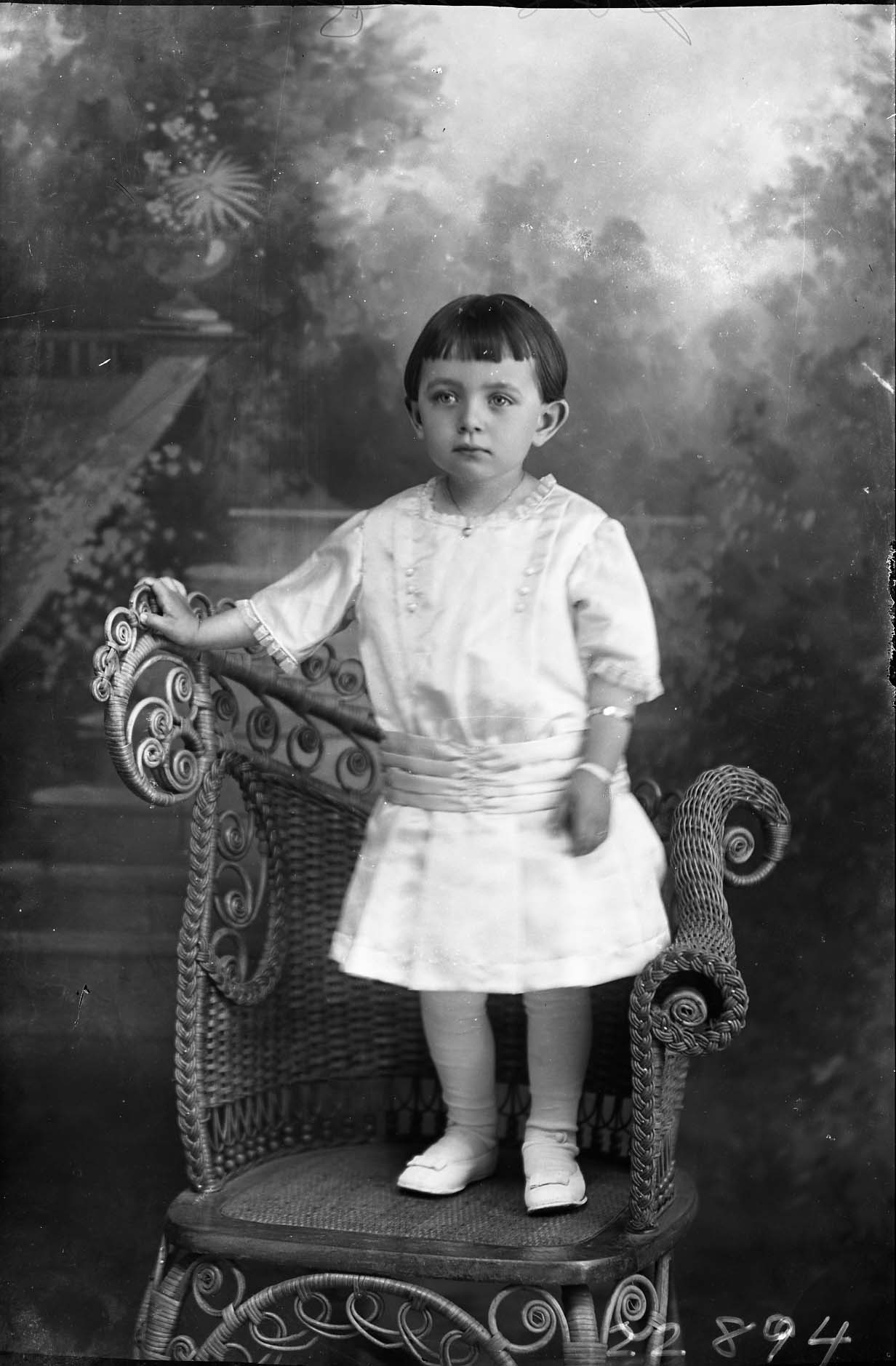Unidentified child with short hair and bangs is standing on a wicker chair.