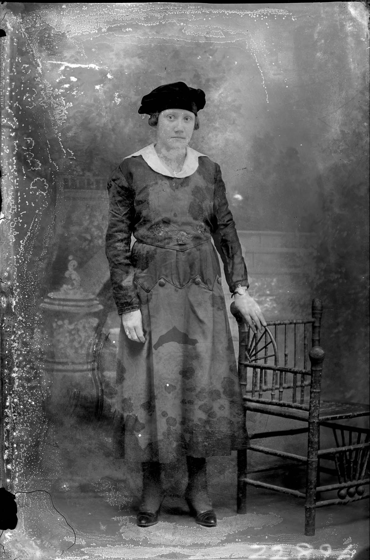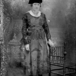 Unidentified woman is standing by a chair and wearing a beret with her dress.