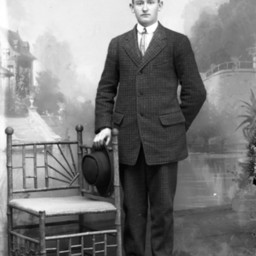 Unidentified man wearing a suit and tie with a starched collar, is standing by a chair with one hand behind his back and the other holding a hat.