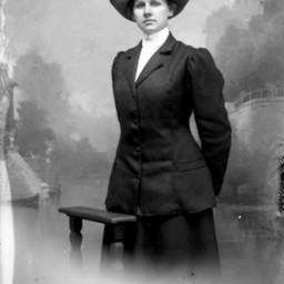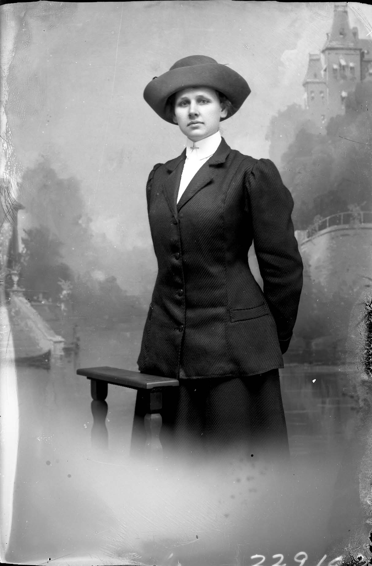 Unidentified woman in a hat, is standing by a chair with both hands behind her back.