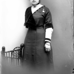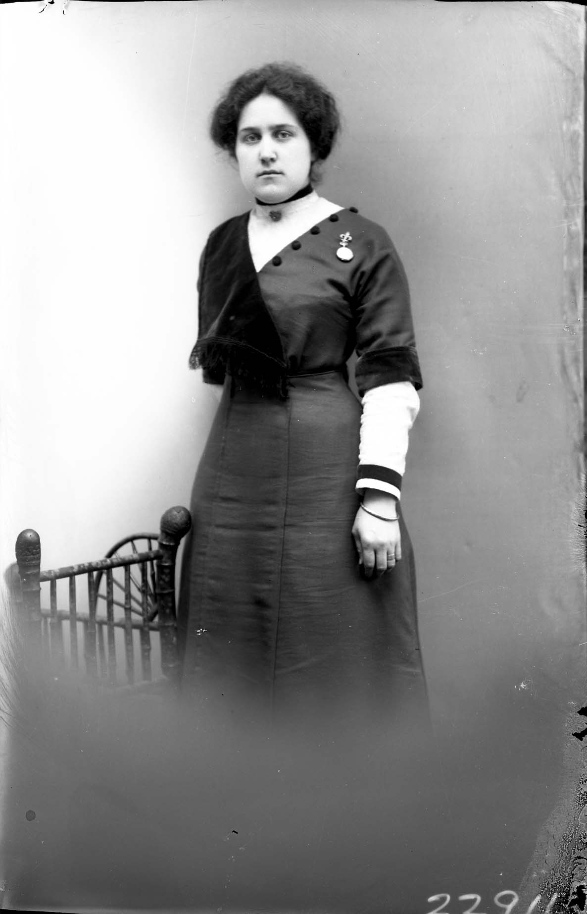 Unidentified woman wearing a long-sleeved dress with a locket or watch pinned to the front, is standing by a chair.
