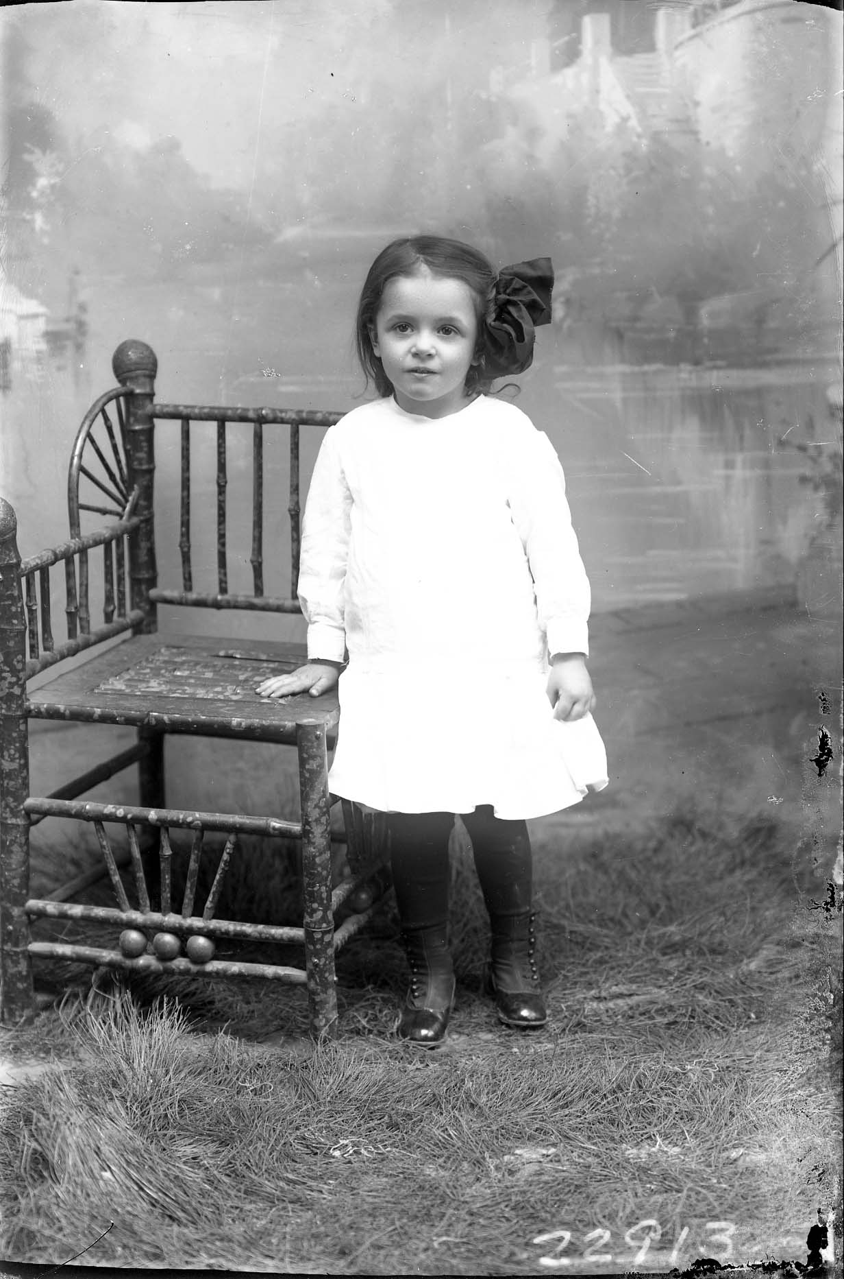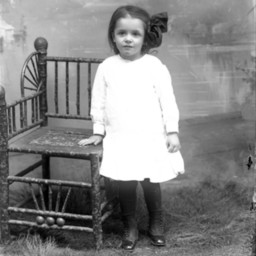 Unidentified girl with a bow in her hair is standing by a chair.