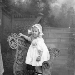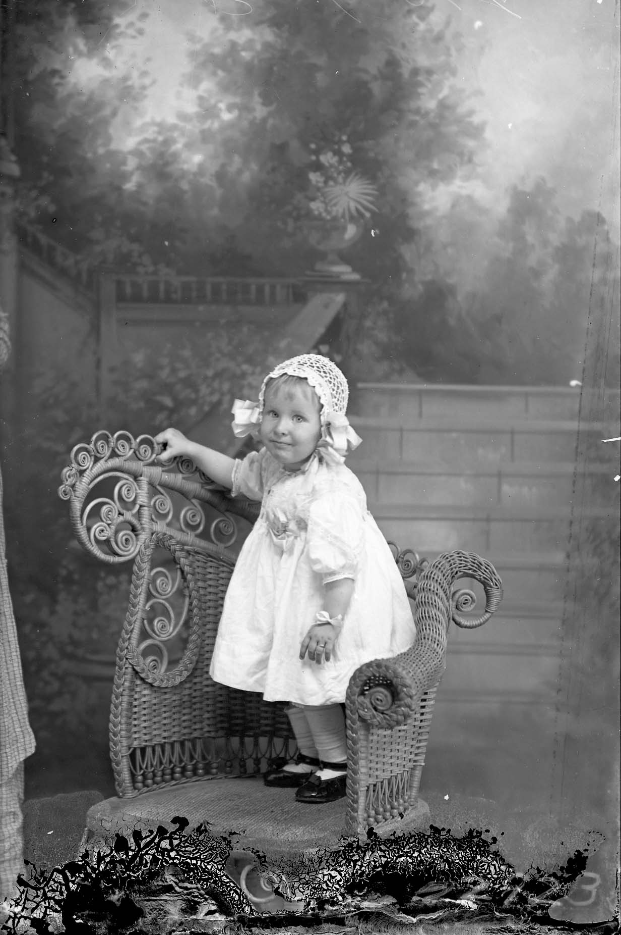 Unidentified young girl in a hat with bows on each side is standing on a wicker chair.