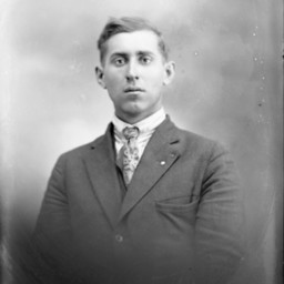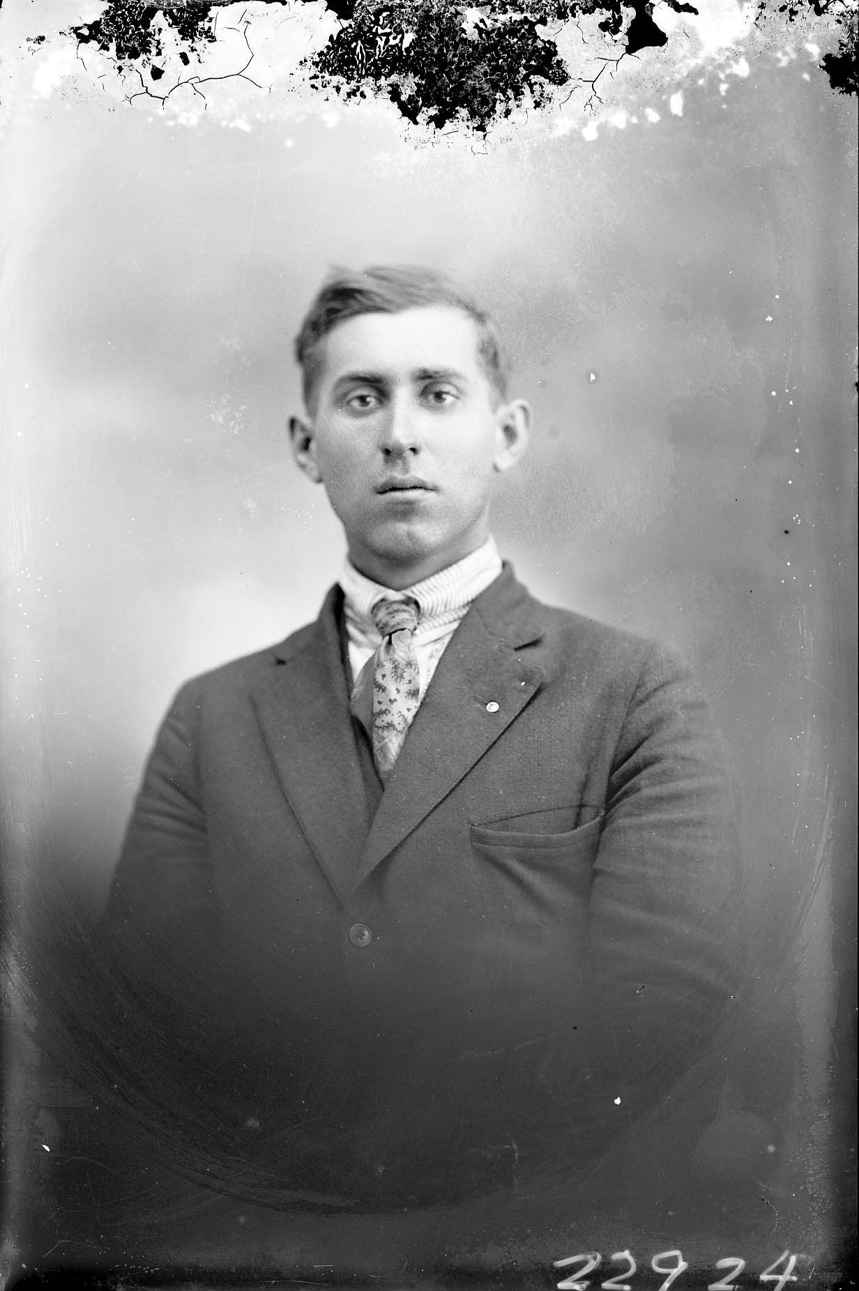Portrait photograph of an unidentified young man wearing a suit and tie with a pin on his lapel.