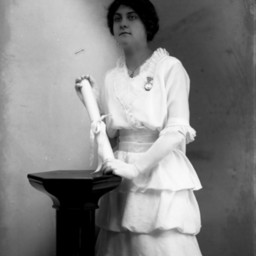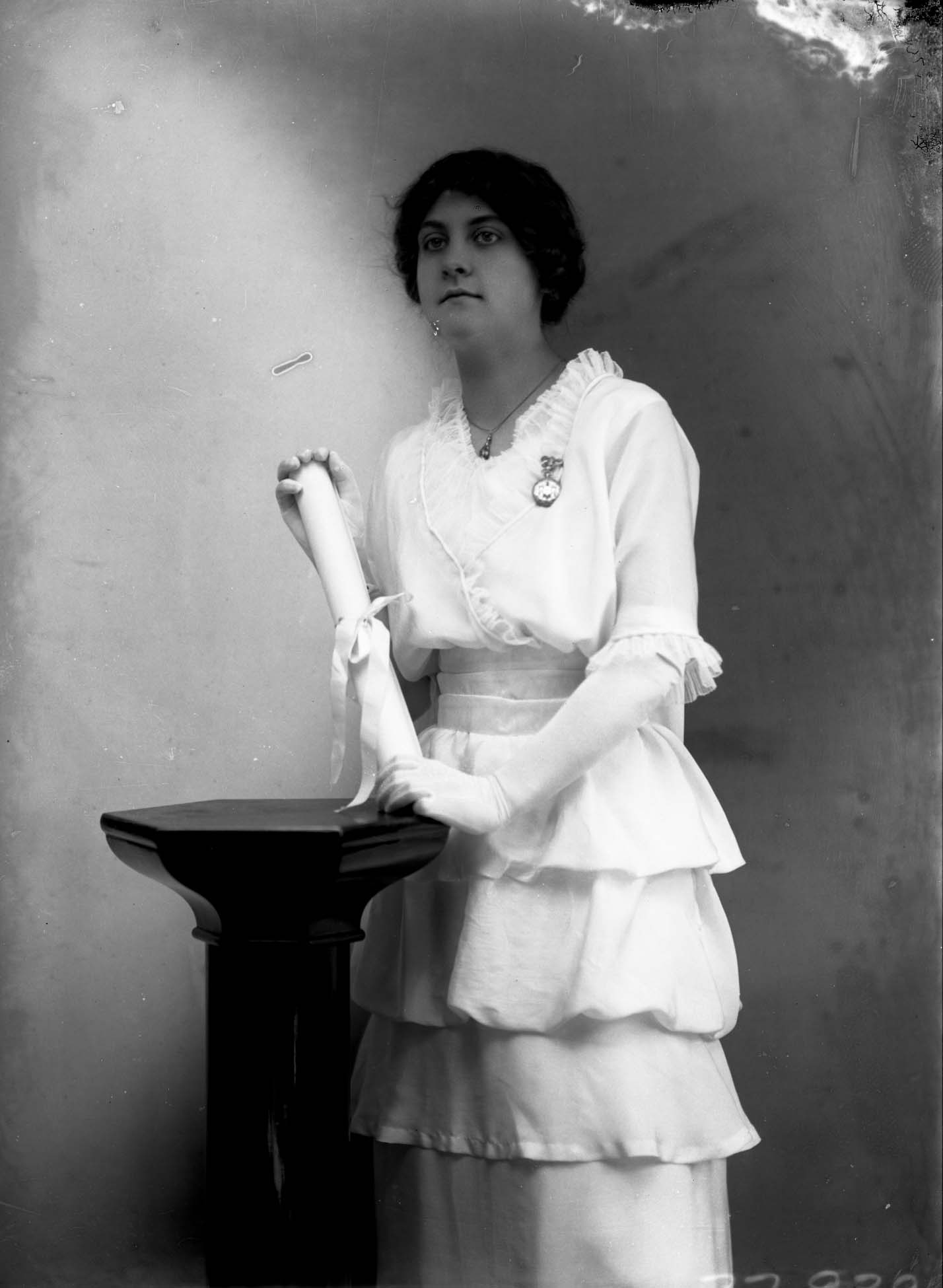 Unidentified woman wearing a white dress with ruffles, is standing by a studio column and holding a rolled certificate or diploma of some kind.