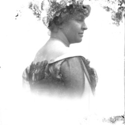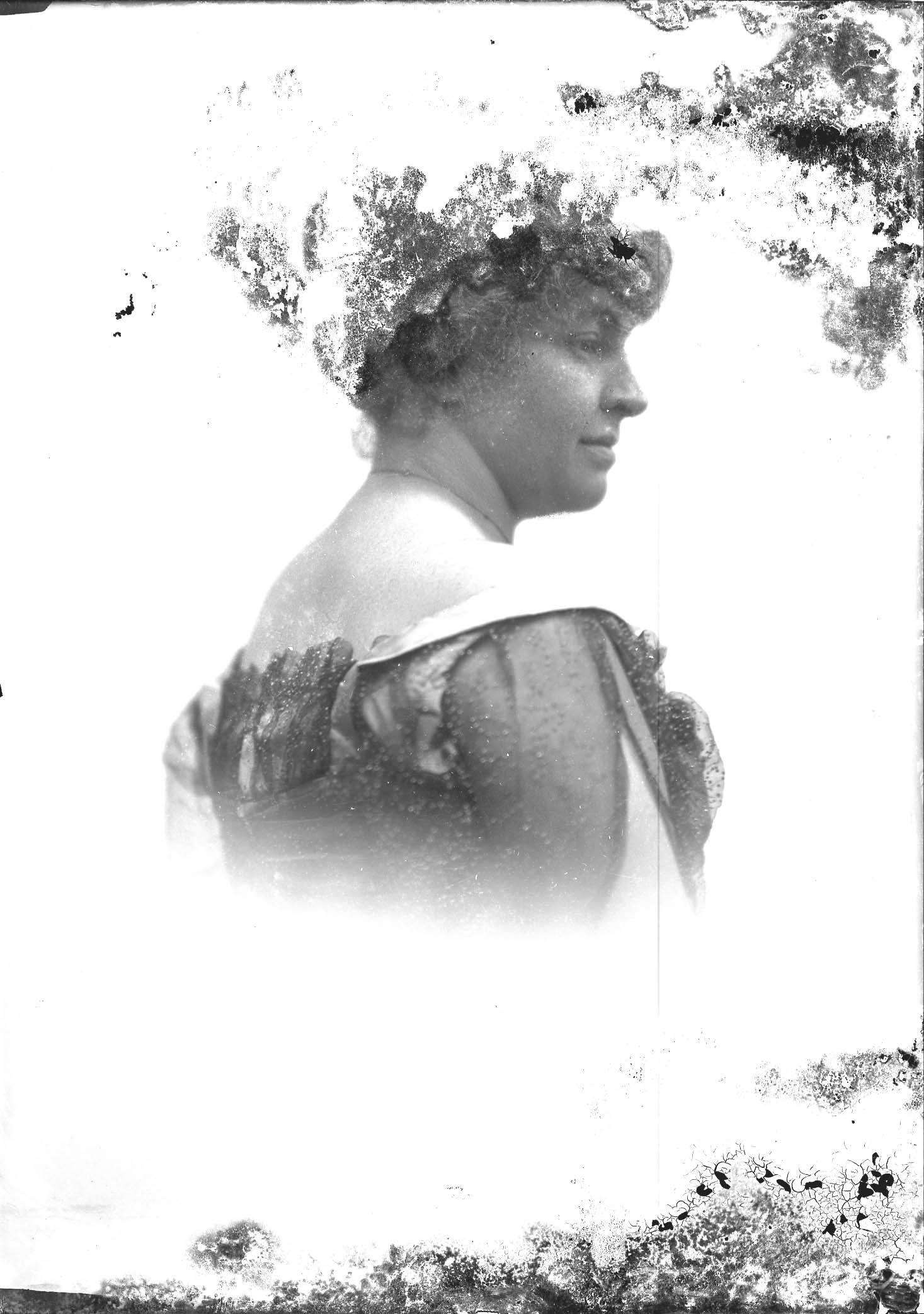 Damaged portrait photograph of an unidentified woman shown from the side, in profile.