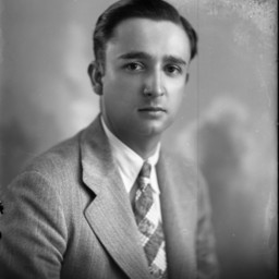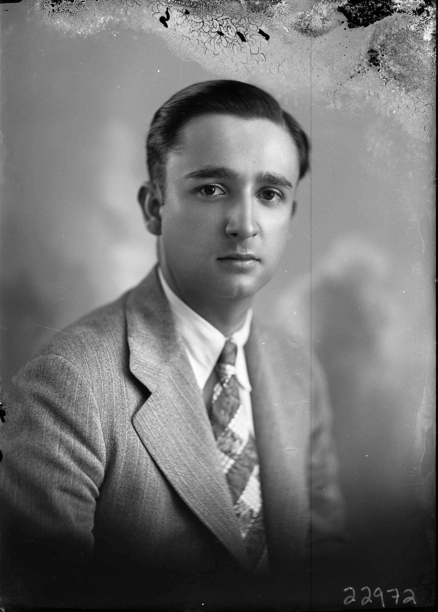 Portrait photograph of an unidentified young man wearing a suit and patterned tie.