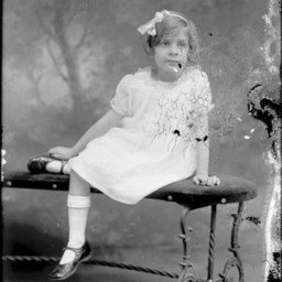 Unidentified girl with a ribbon tied in her short hair is seated on a bench with one leg under the other.