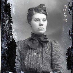 Portrait photograph of an unidentified woman with a bow in her styled hair and another larger bow tied at her neck.