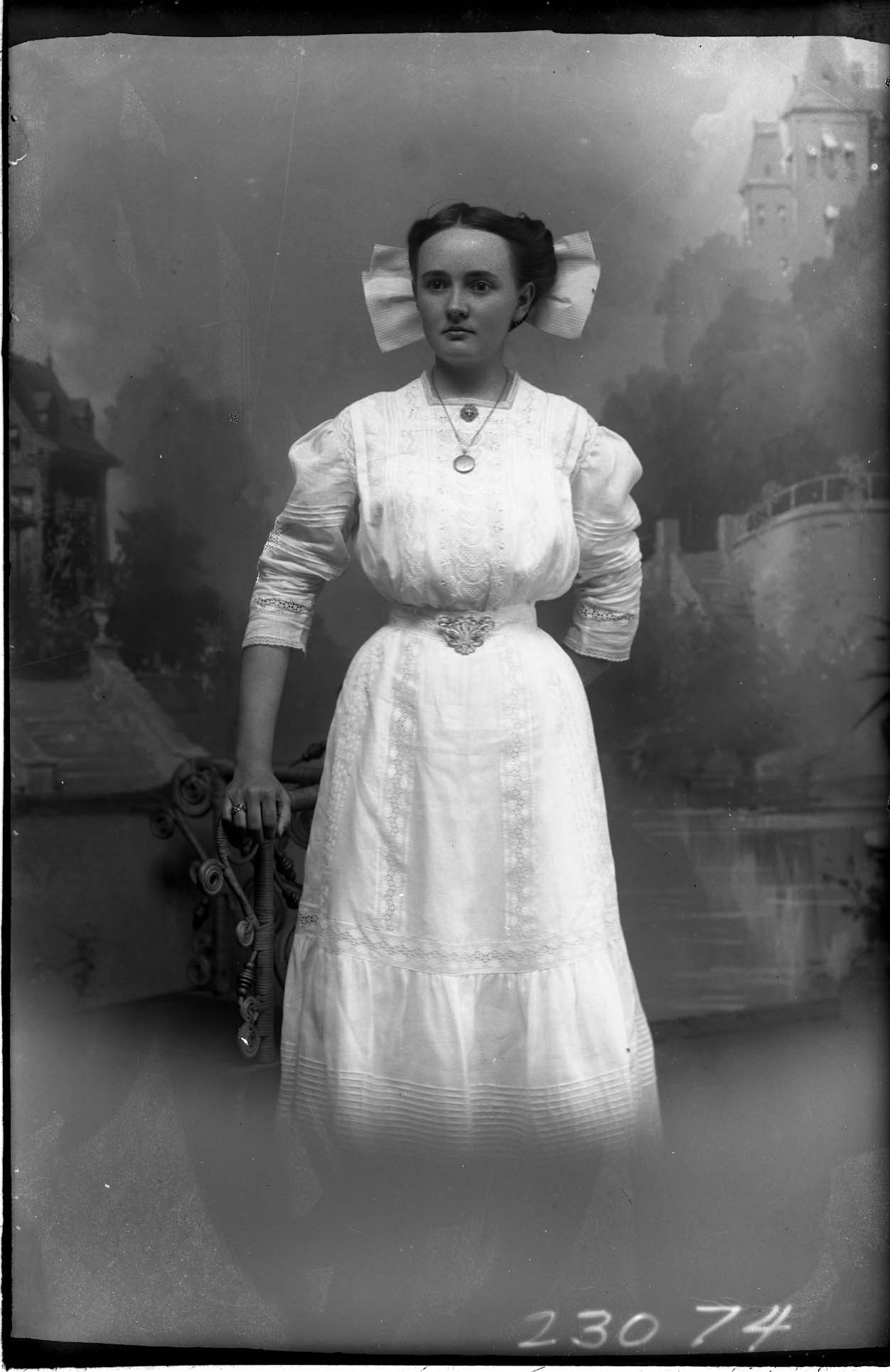 Unidentified woman with a large bow in her hair is standing and wearing a locket around her neck.