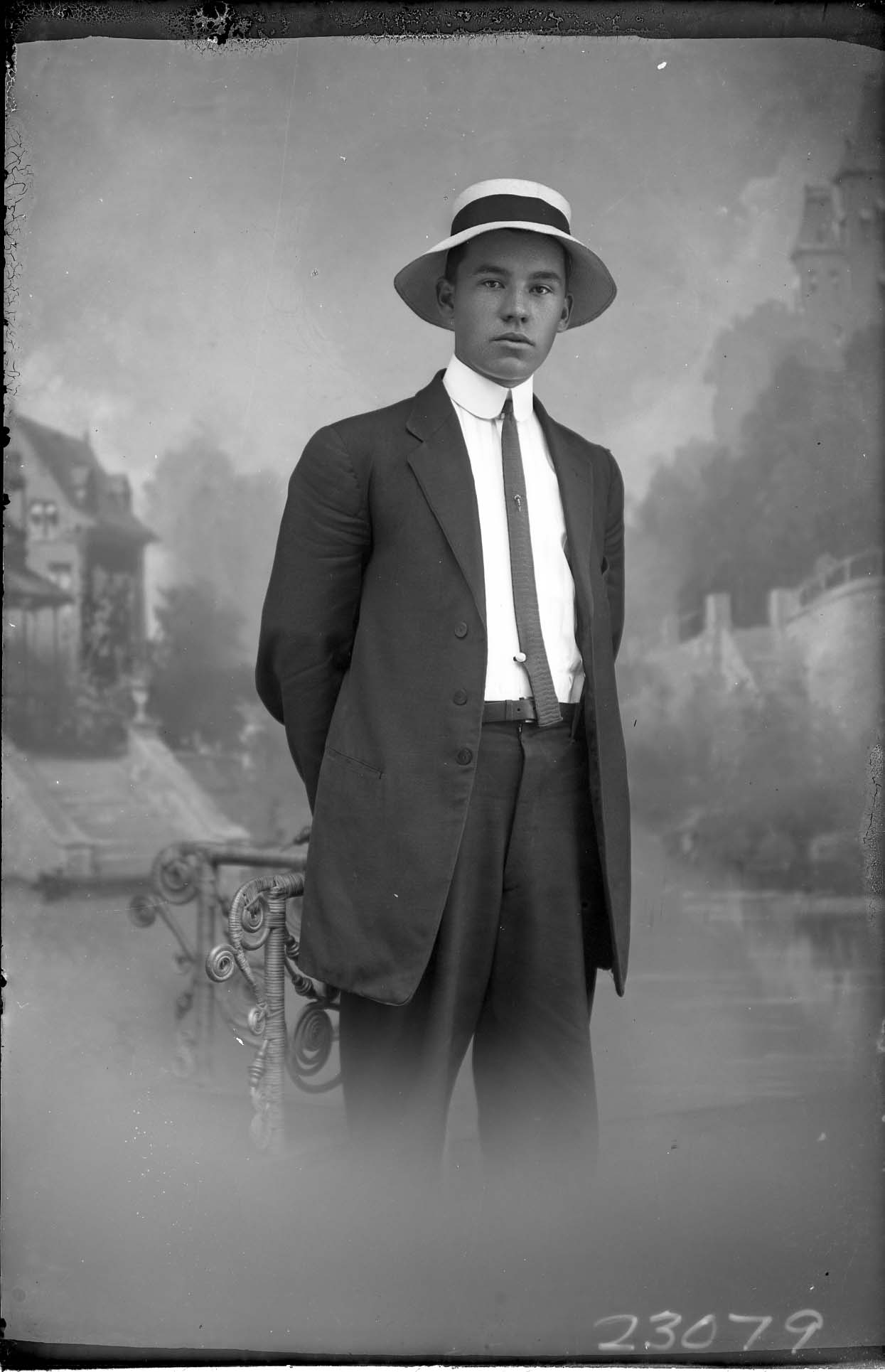 Unidentified young man wearing a hat, suit and tie with a starched collar, is standing with his hands behind his back.