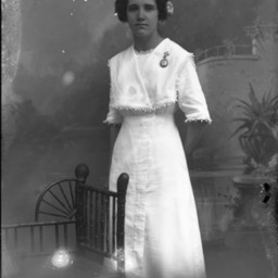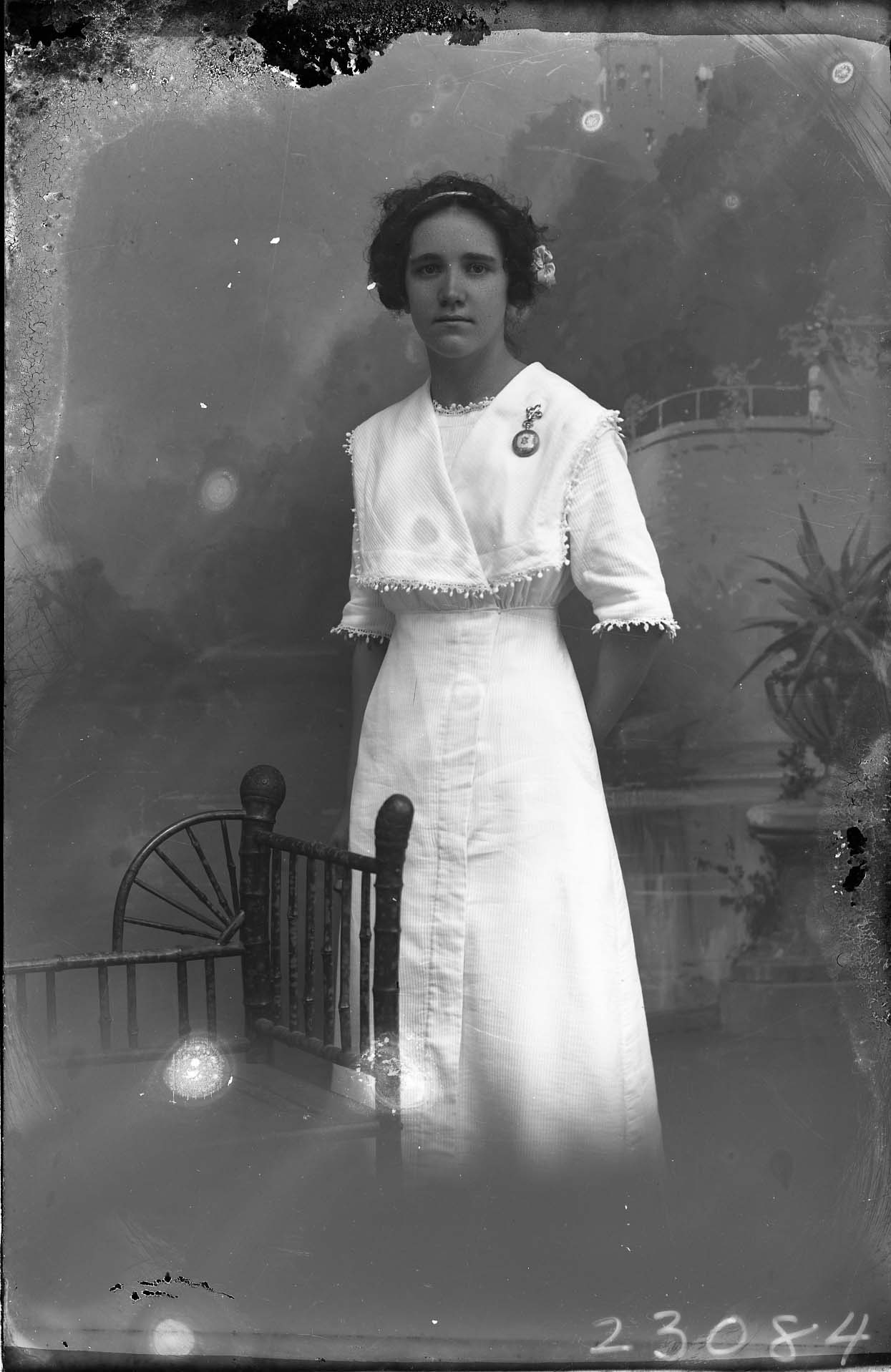 Unidentified young woman with a head band in her hair is standing by a chair and wearing a locket or pocket watch pinned to her long dress.