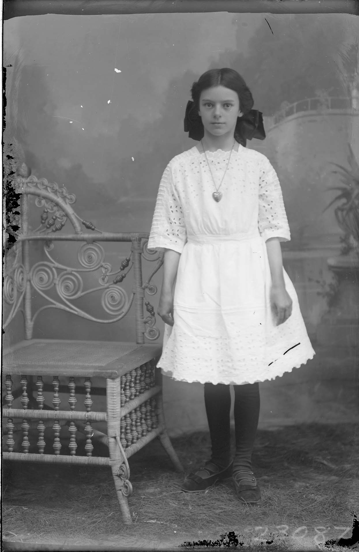 Unidentified girl with a bow in her hair is standing by a wicker chair and wearing a locket around her neck.