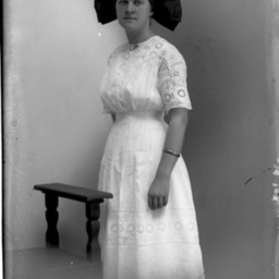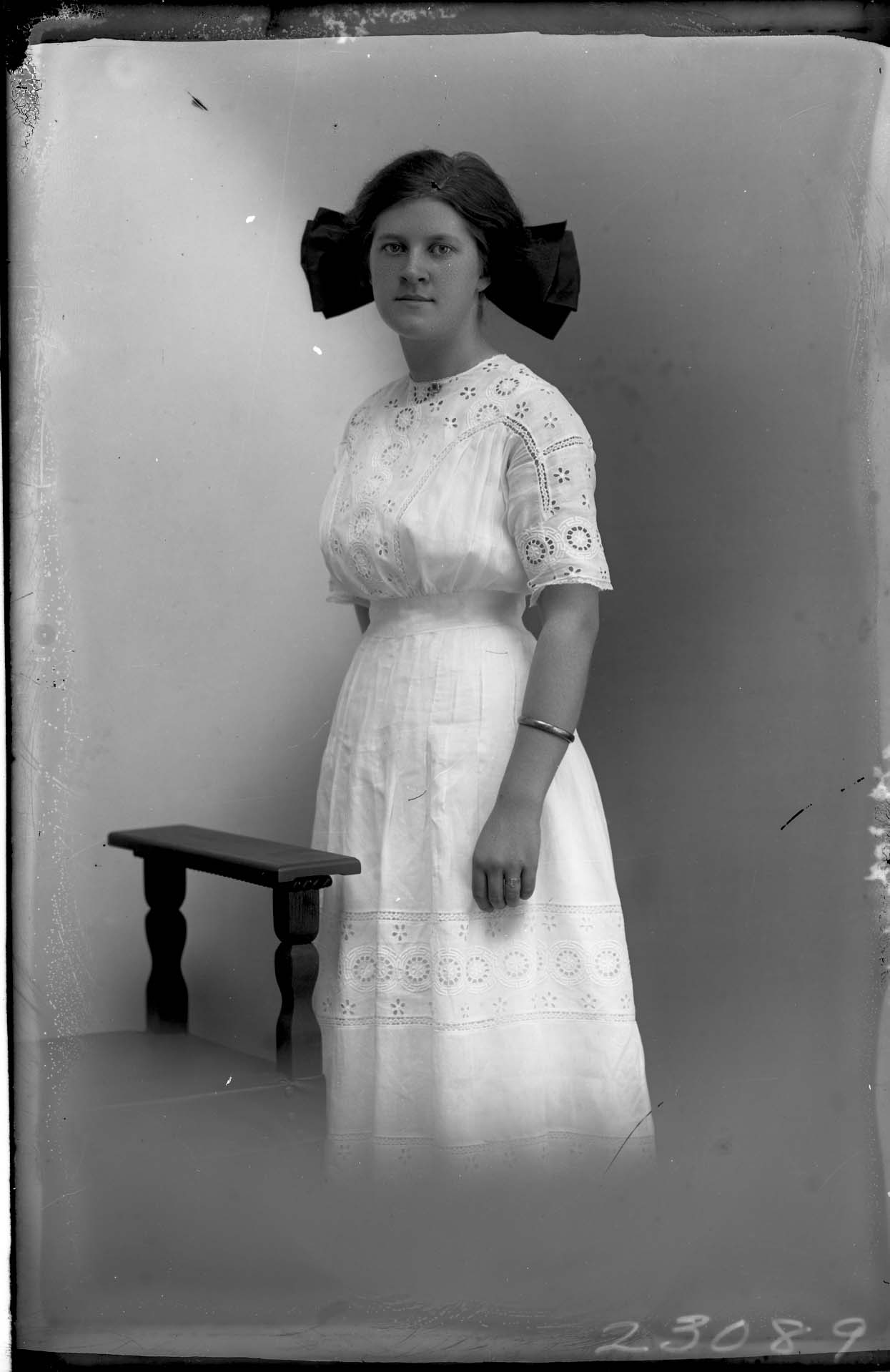 Unidentified woman is standing by a chair with a large dark bow in her hair and wearing a short-sleeved white dress.