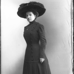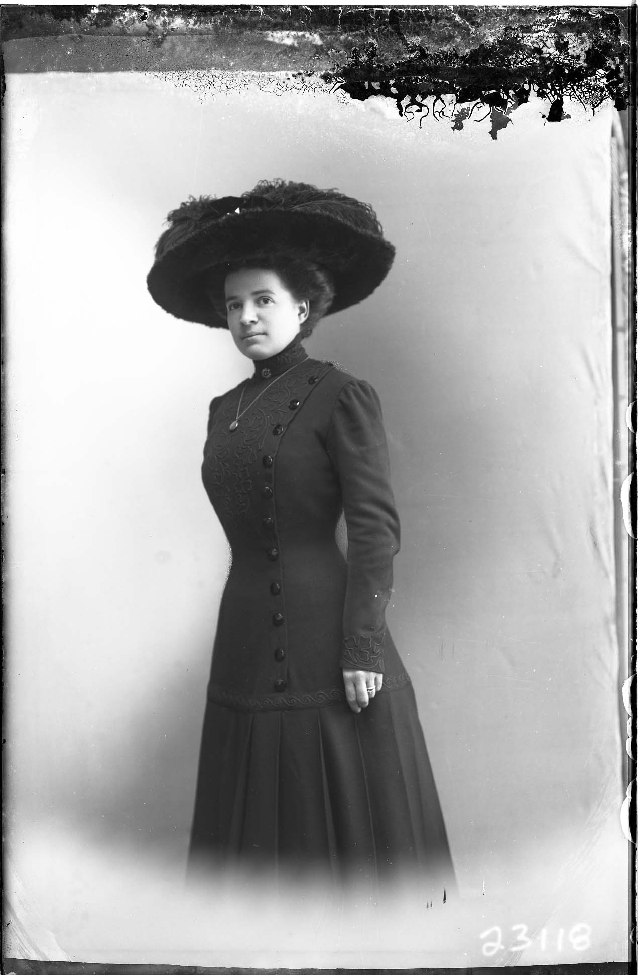 Unidentified woman wearing a large hat with feathers and a locket, is standing with her arm at her side.