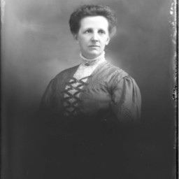 Portrait photograph of an unidentified woman with here hair pulled up and wearing a high collar on her dress.