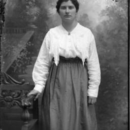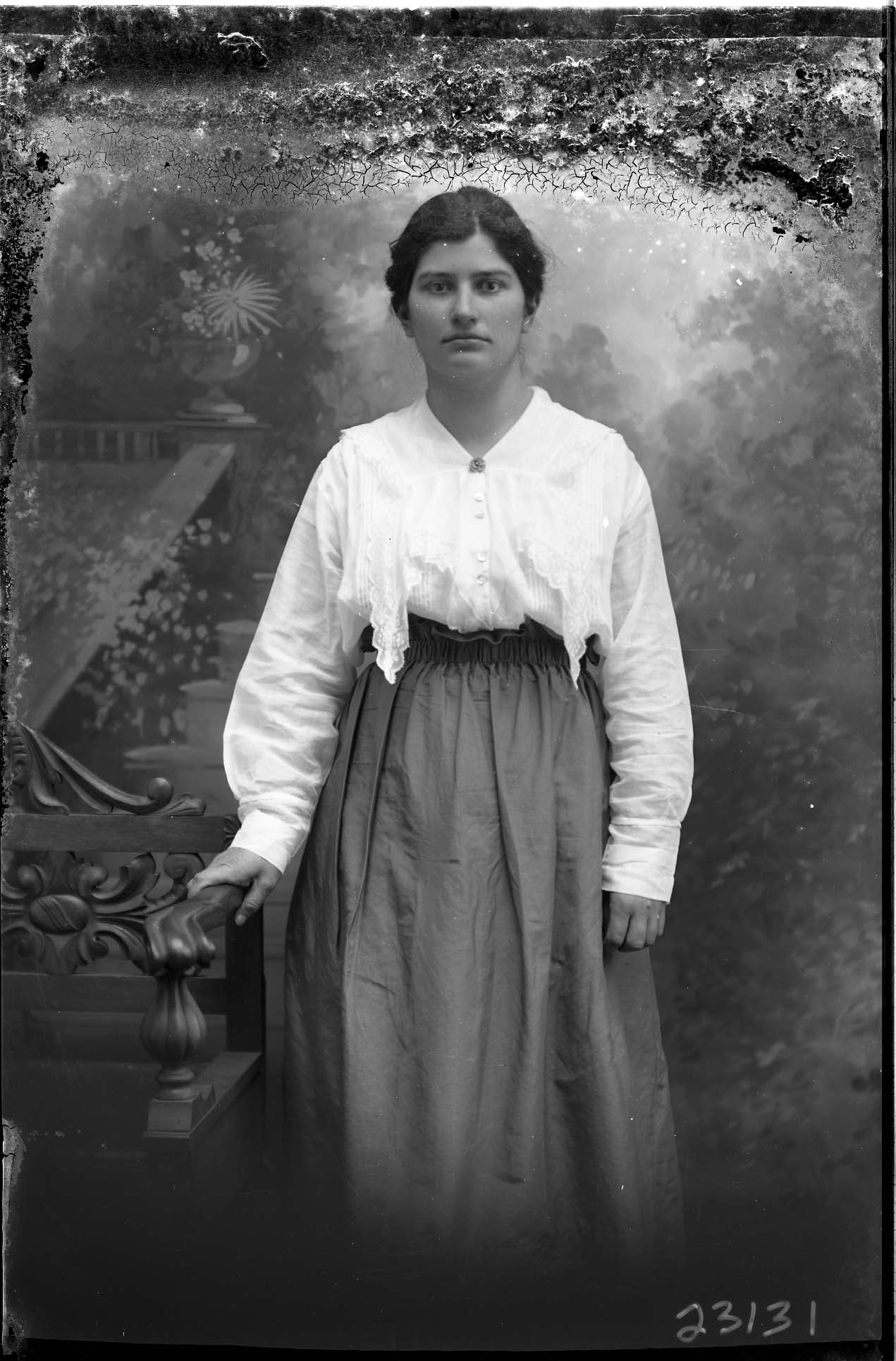 Unidentified woman with her hair pulled back is standing by a bench and wearing a long-sleeved blouse and skirt.