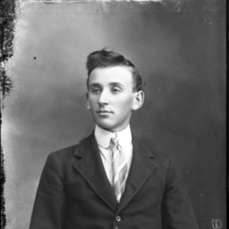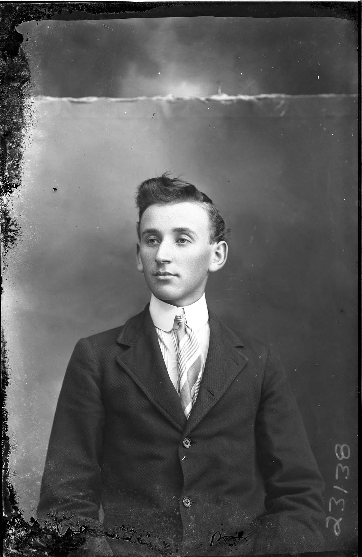 Portrait photograph of an unidentified young man in a suit and striped tie with a starched collar.
