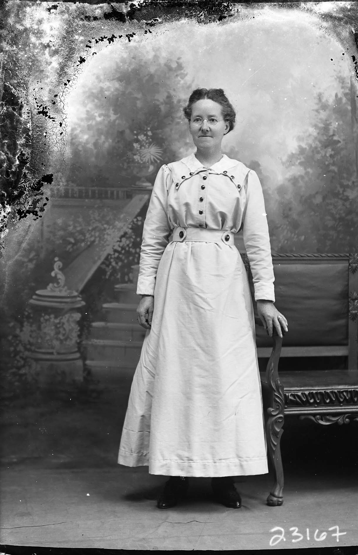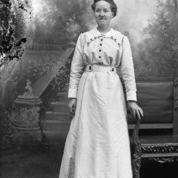 Unidentified woman with her hair pulled back is standing by a bench in a long dress.