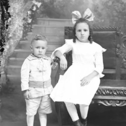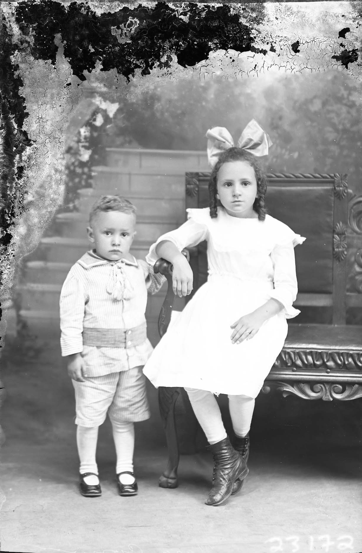 Two unidentified children, a little boy and an older girl with a bow in her hair, are posed together.