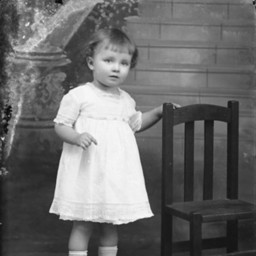Unidentified child with short hair and bangs is standing by a child-sized chair.