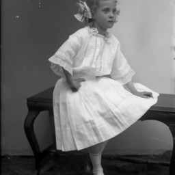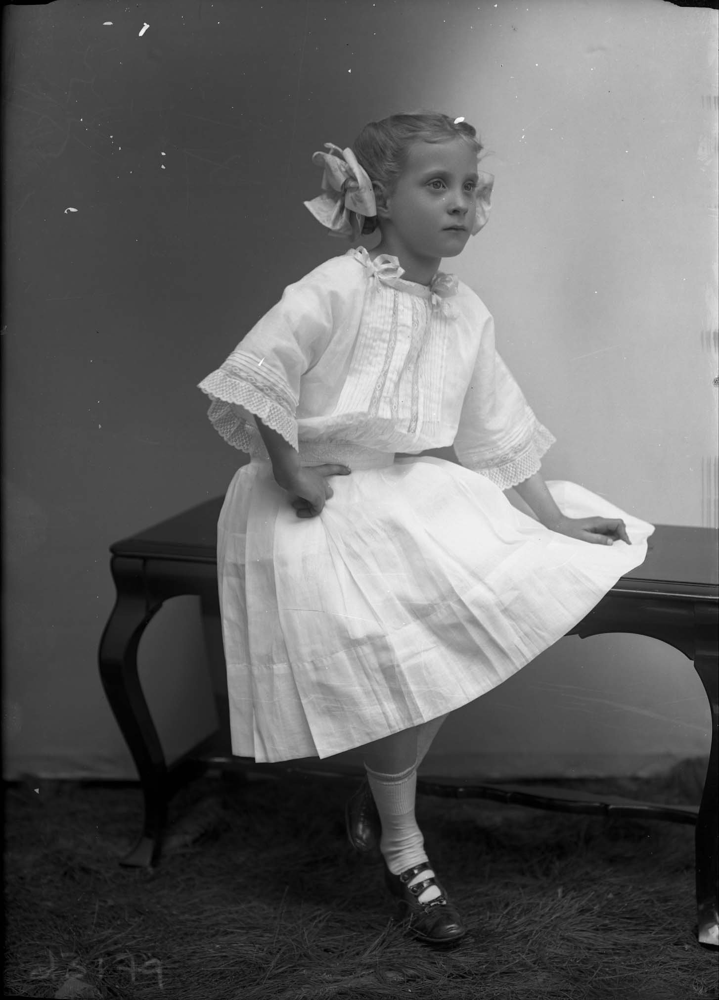 Unidentified girl with a bow in her hair is sitting on a bench with one hand on her hip.