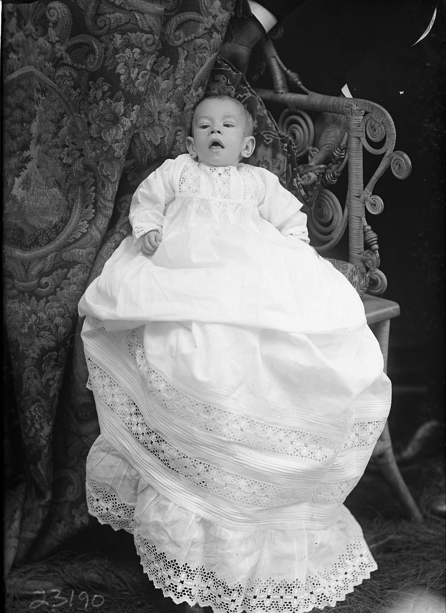 Unidentified baby in a long white gown is posed on a wicker chair.
