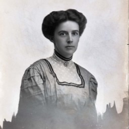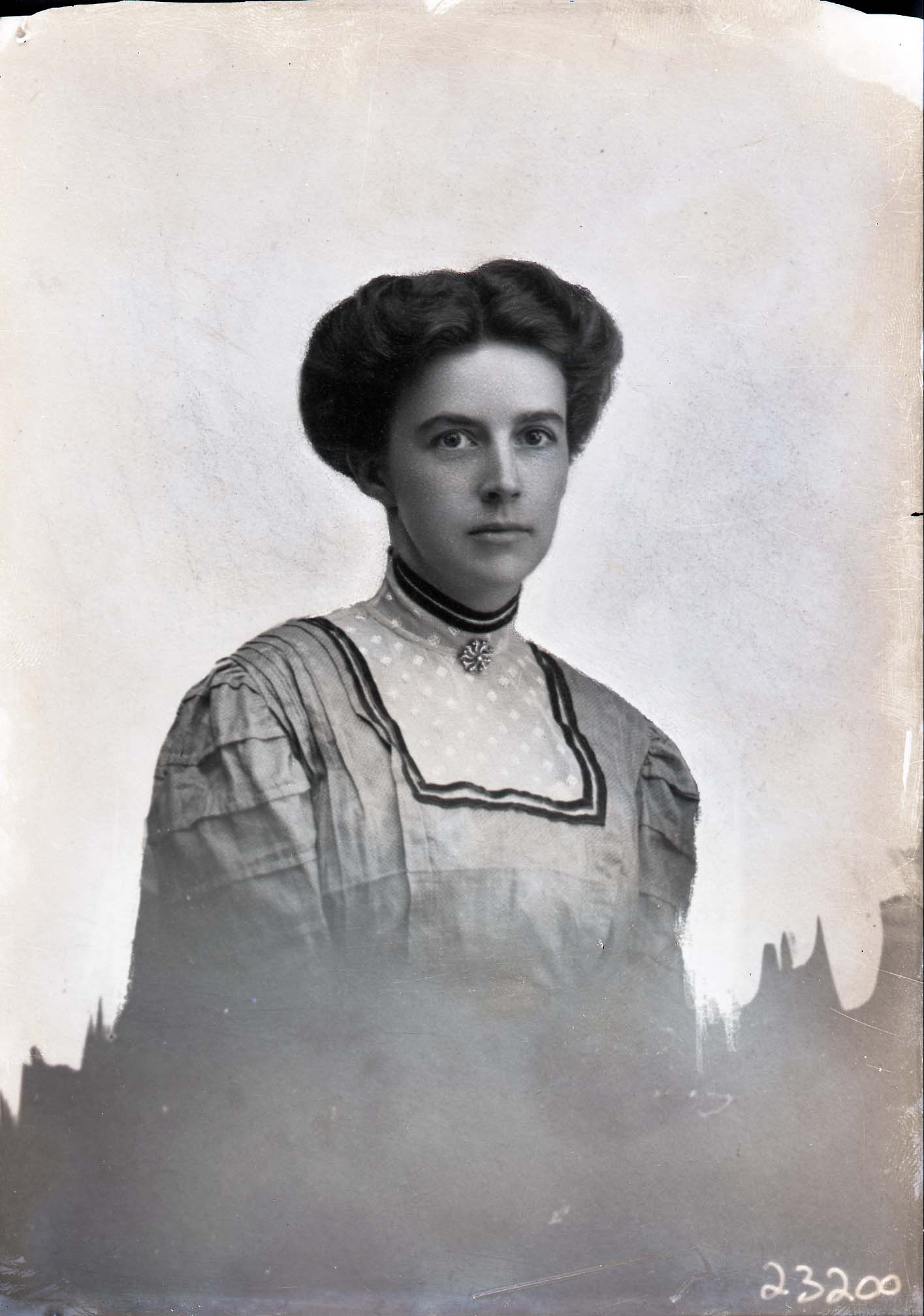 Portrait photograph of an unidentified woman wearing her hair styled up.