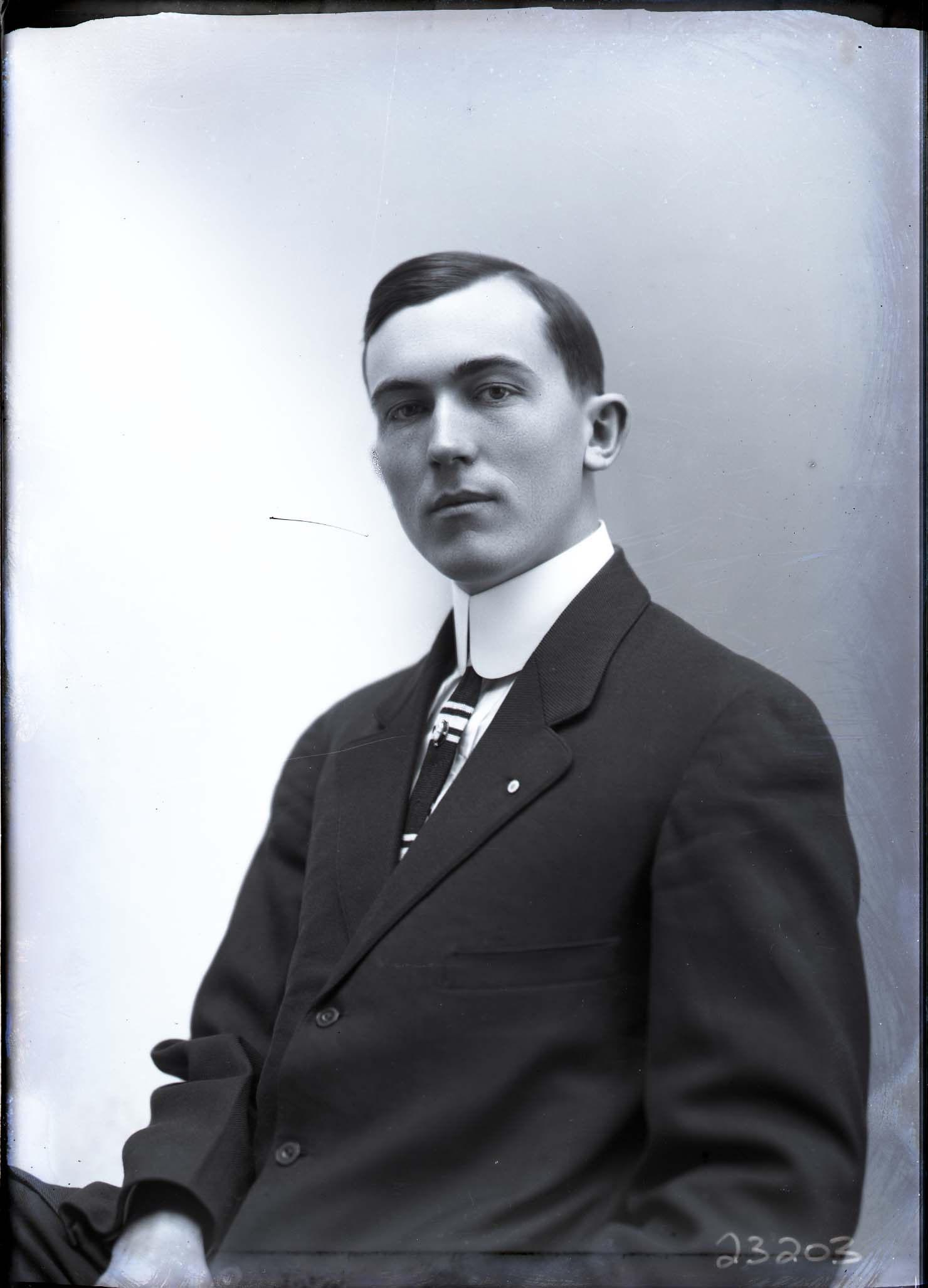 Portrait photograph of an unidentified man wearing a suit and tie with a starched collar and a pin on his lapel.
