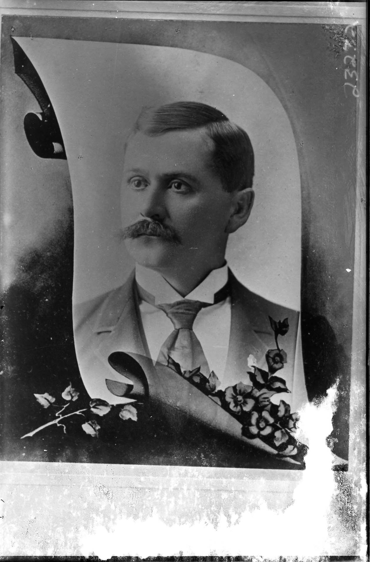 Photo of a portrait photograph of an unidentified man with a mustached and wearing a suit and tie.